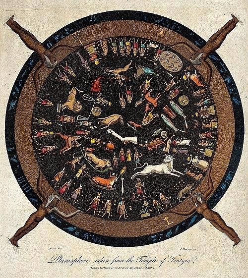 Dans le zodiaque de Dendérah (ci-dessous) découvert pendant la Campagne d’Egypte, on repère plusieurs constellations telles que nous les nommons encore. Cette sorte de carte céleste date de la période hellénistique de l’Egypte (premier siècle avant notre ère).